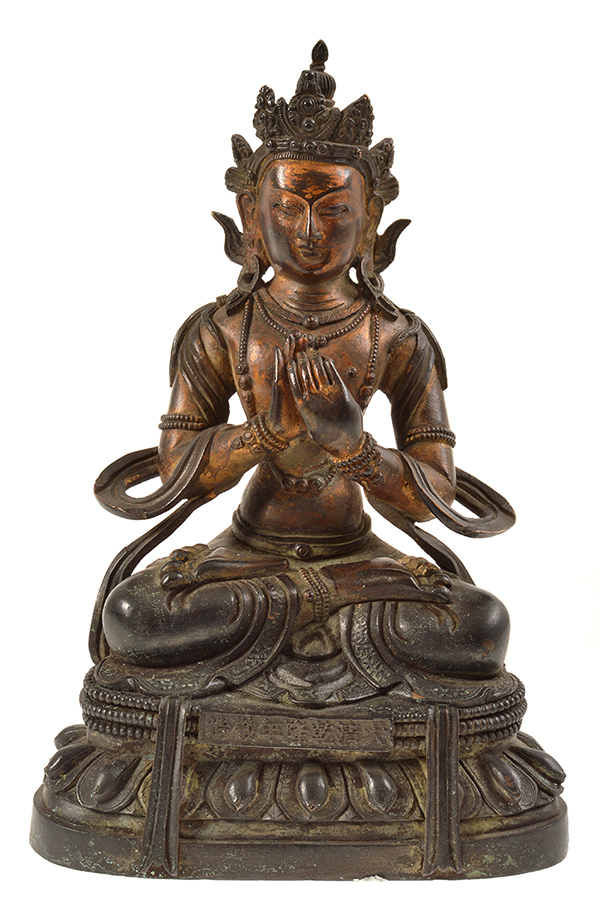 A SINO-TIBETAN PARCEL-GILT BRONZE FIGURE OF VAIROCANA