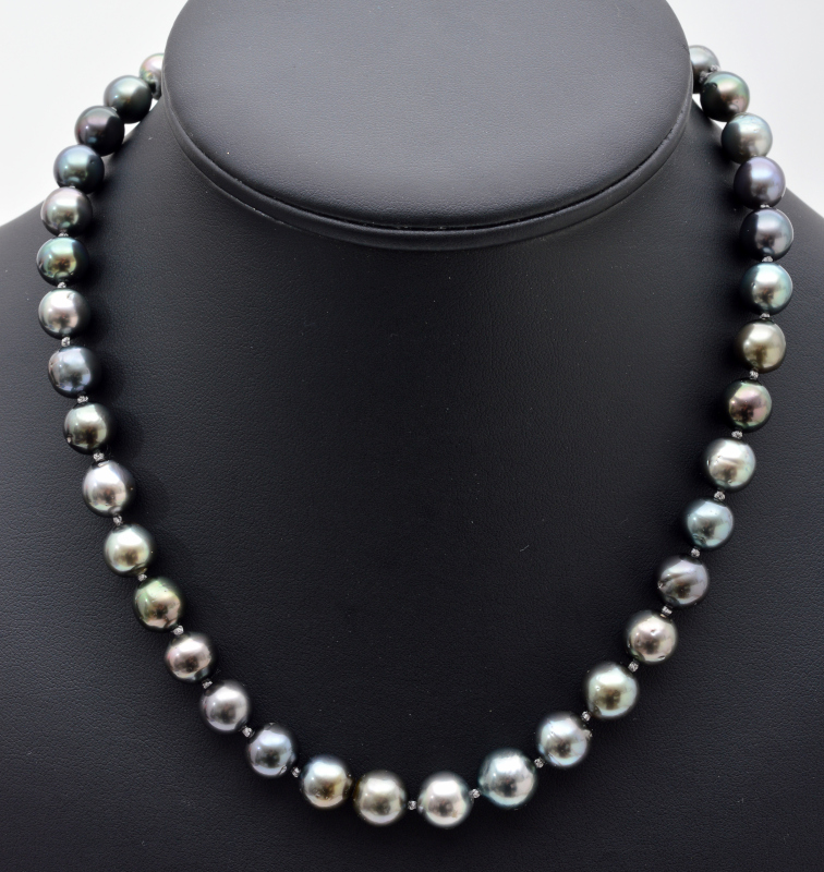 A STRAND OF BLACK PEARLS TO A 9CT WHITE GOLD CLASP