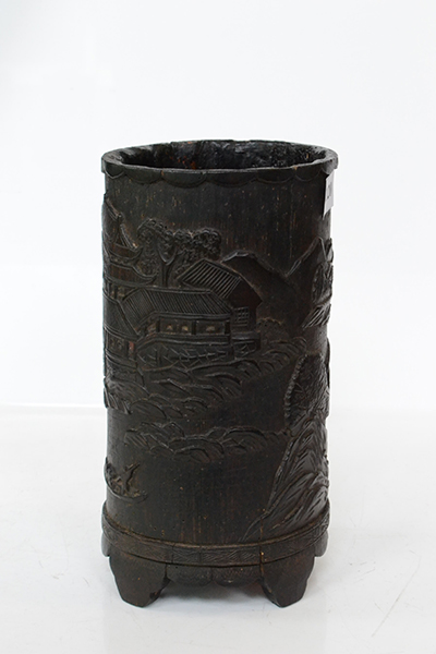 A BAMBOO BRUSH POT WITH RELIEF CARVED VILLAGE SCENES