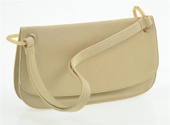 Styled in cream canvas with conforming strap and resin hardware, 30 x 17 x 6cm.