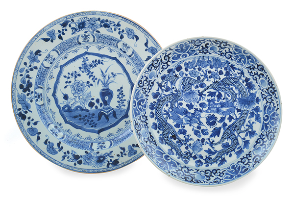 the first with rich blue underglaze, depicting a central motif of a pair of contesting dragons chasing the flaming pearl of wisdom, amongst a foliate background, and surrounded by a scrolling lotus border;