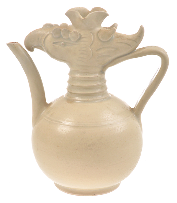the high-fired stoneware ewer covered overall with a translucent qingbai glaze, that is light grey buff in colour, the body with applied handle and spout. The phoenix head with rounded beak and details incised, one incised band to the body, three raised rings on the neck, with an unglazed base, 19.5cm high