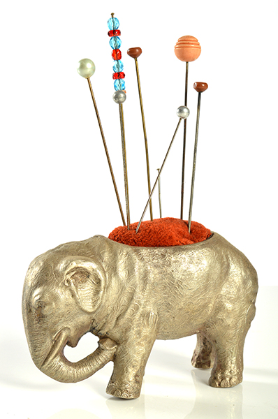 AN EARLY 20TH CENTURY ELPEHANT PIN CUSHION WITH HAT PINS