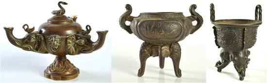 TWO ASIAN ELEPHANT THEMED INCENSE BURNERS AND AN OIL LAMP