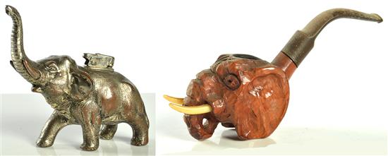 A SMALL ELEPHANT SHAPED TABLE LIGHTER ALONG WITH AN ELEPAHNT CARVED PIPE