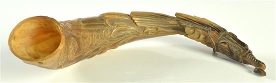 AN UNUSUAL CARVED HORN POWDER MULL WITH AN ELEPHANT CARVED TIP