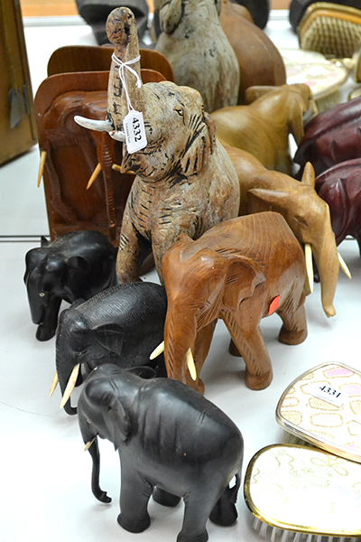 A COLLECTION OF SEVEN WOOD CARVED ELEPHANT FIGURES OF VARYING SIZES AND A PLAQUE