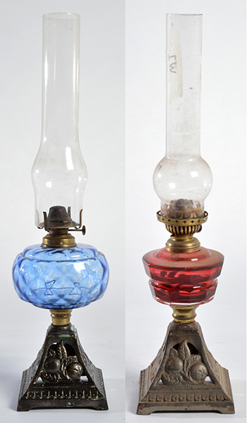 TWO EARLY 20TH CENTURY KEROSENE LAMPS WITH BERRY THEMED BASE