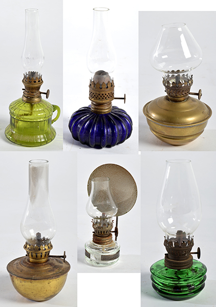 A GROUP OF SIX SMALL KEROSENE LAMPS, SOME WITH COLOURED GLASS FONTS