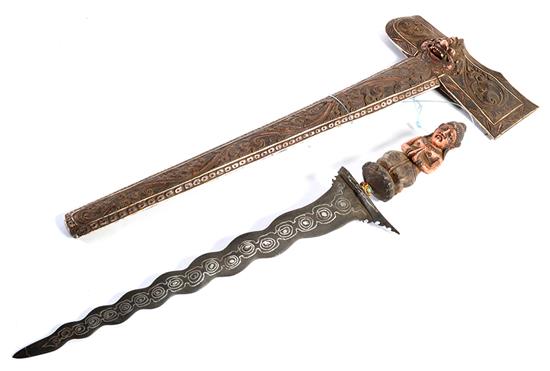A 19TH CENTURY INDONESIAN KRIS KNIFE WITH FIGURAL HILT AND GARUDA HEAD SHEATH