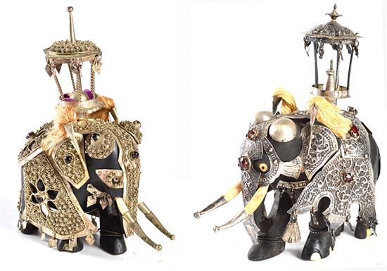 TWO SMALL LATE 19TH CENTURY/EARLY 20TH CENTURY EBONY PROCESSIONAL ELEPHANTS CARRYING HOWDAH