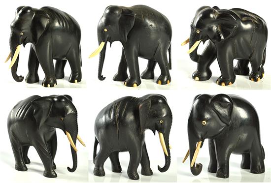 SIX 19TH CENTURY AND LATER EBONY ELEPHANTS IN VARYING SIZES