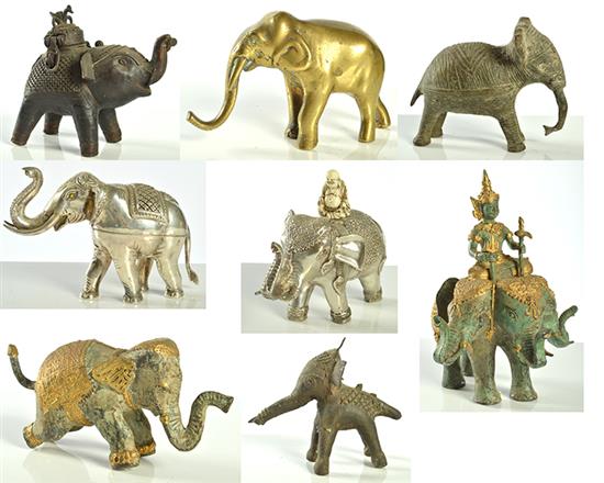A COLLECTION OF ASSORTED ELEPHANT FIGURES FASHIONED FROM VARIOUS METALS INCL A DOWRY BOX