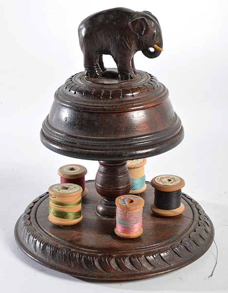 AN EARLY 20TH CENTURY THREAD STAND WITH ELEPHANT FINIAL, INCLUDING THREAD