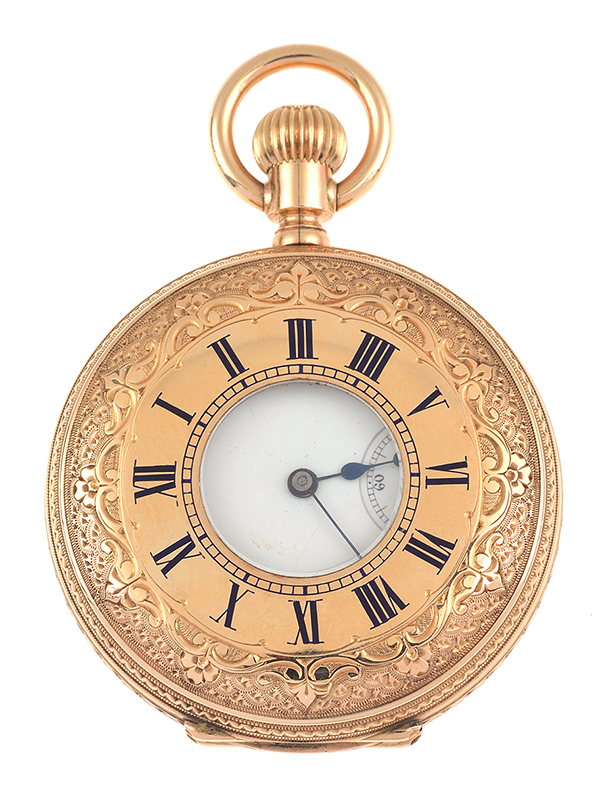 Crown wind and lever set movement, circular white dial with black Roman numerals, movement signed Am Watch Co, Waltham, 10ct gold engraved case with blue enamel Roman numerals, 40mm diameter.