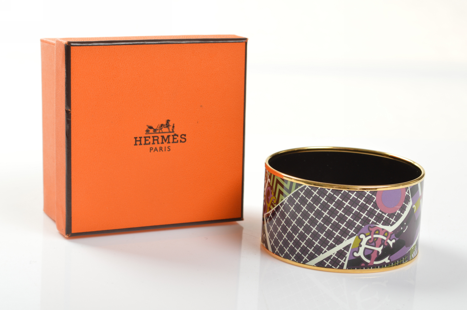 The wide bangle styled with an abstract pattern in tones of purple and green, with a gilt finish, diameter 67mm, with box.