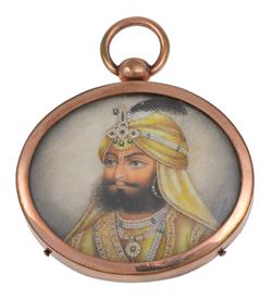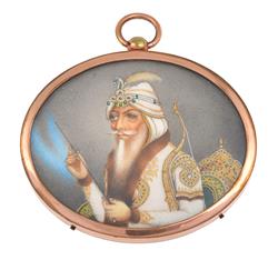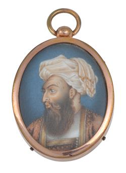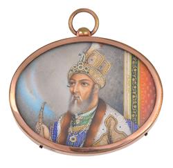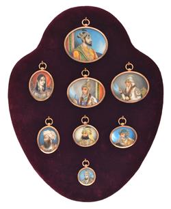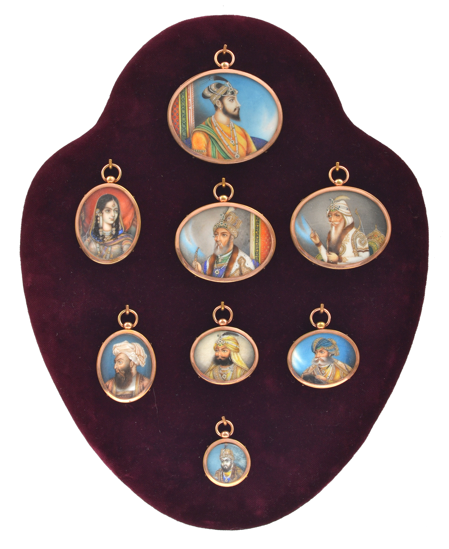 comprising eight oval and circular ivory panels finely painted with various emperors and empresses from India and Afghanistan, mounted in gold lined frames