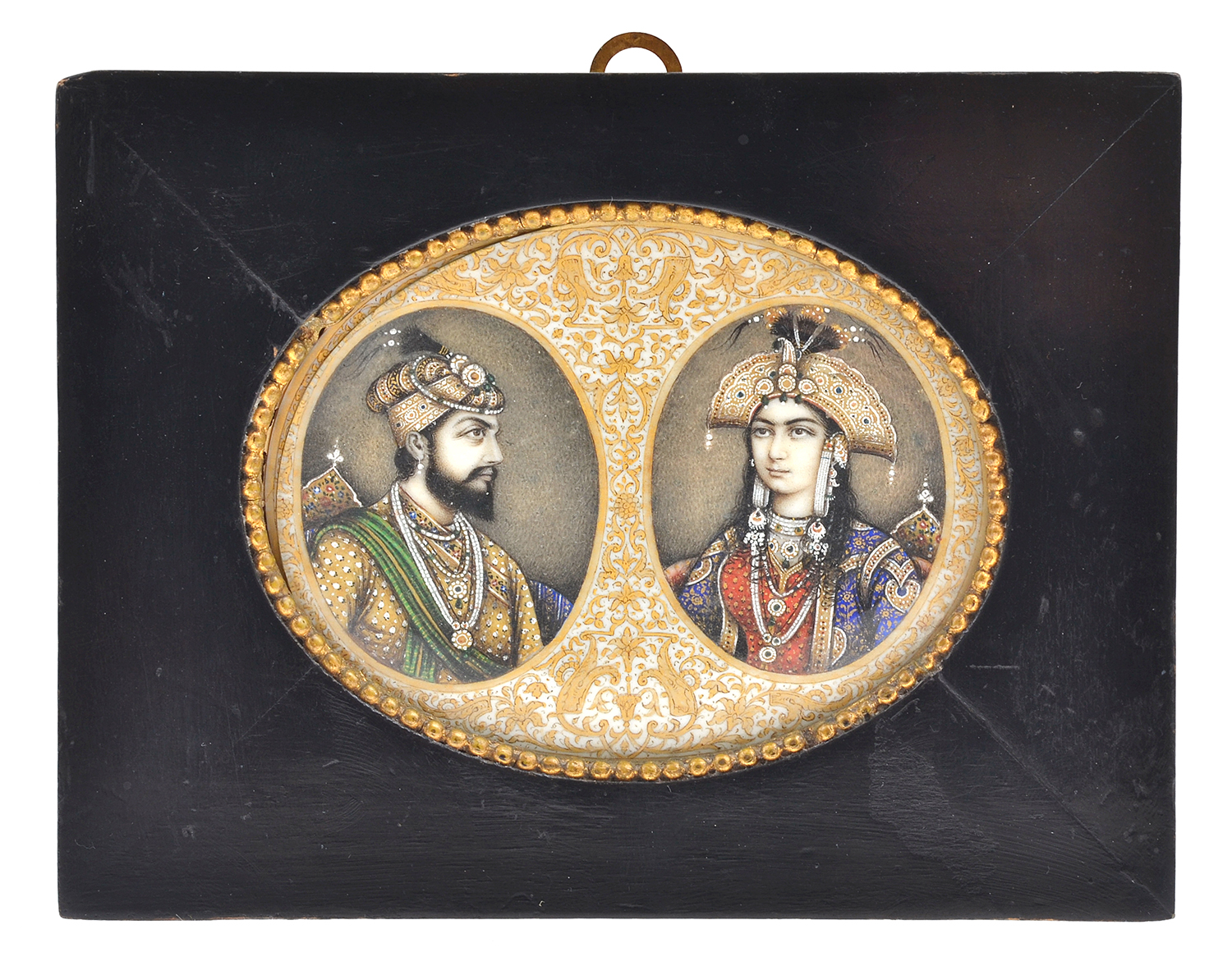 the finely painted oval ivory panel depicting two portraits of the emperor Shah Jahan and his wife Mumtaz Mahal, having fine gold scroll and floral decoration throughout, 9.5cm diameter, the frame 14cm diameter