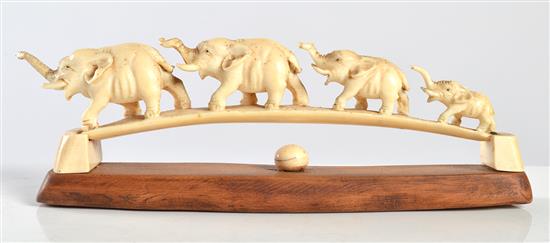 A FOUR ELEPHANT IVORY BRIDGE ON WOODEN BASE