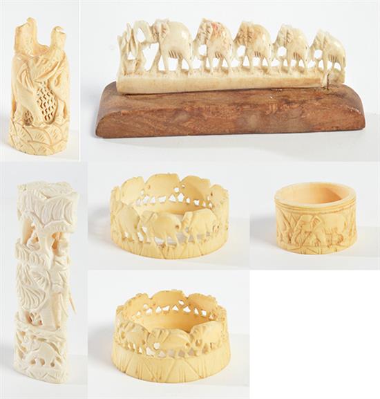 A SMALL GROUP OF BONE AND IVORY CARVED ITEMS INCL. NAPKIN RINGS, FIGURES, BRIDGES ETC