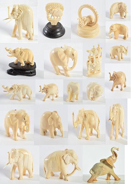 A LARGE COLLECTION OF IVORY CARVED ELEPHANTS IN VARYING SIZES, AND A LARGE SOAP STONE ELEPHANT (OUTSIDE CABINET)