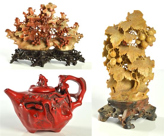 TWO SOAPSTONE CARVING AND A SIMULATED CORAL TEAPOT