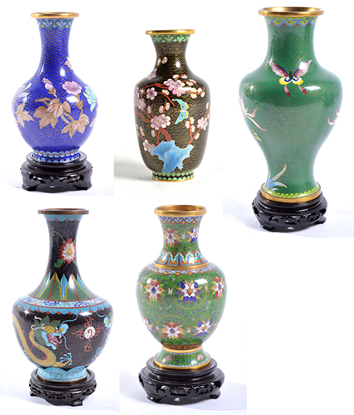 A COLLECTION OF SIX CHINESE CLOISONNE VASES, SOME WITH STANDS