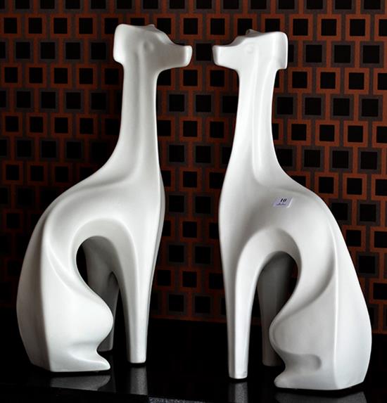 A PAIR OF JONAHAN ADLER MATT GLAZED CERAMIC FIGURES OF GREYHOUNDS, 46.5CM HIGH