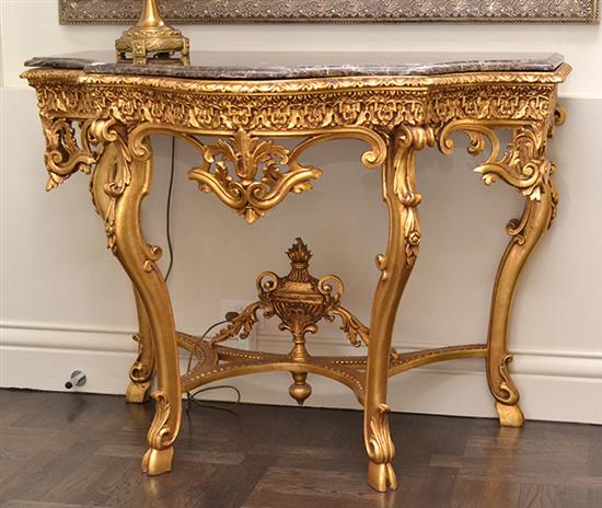 A ROCOCO STYLE GILT FRAMED MARBLE TOP CONSOLE, 118 X 89 X 66.5CM