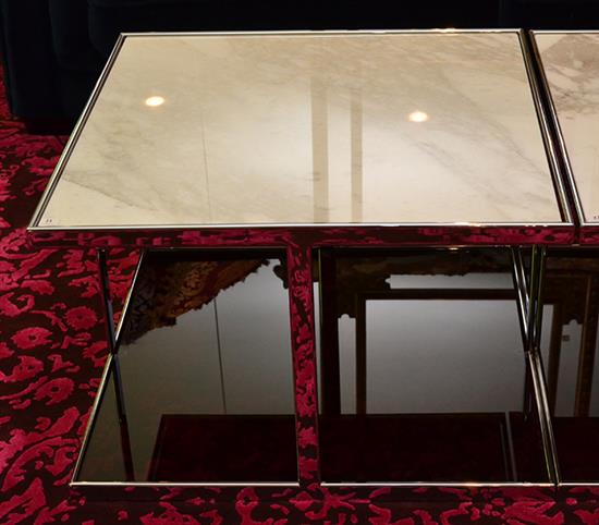 A CONTEMPORARY MINOTTI MARBLE TOP OCCASIONAL TABLE WITH SMOKEY GLASS INSET BASE, 70 X 45.5 X 70.5