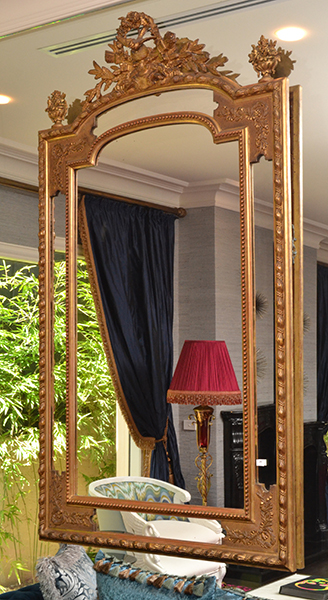 A 19TH CENTURY GILT WOOD FRAMED PIER MIRROR, WITH A MIRRORED SURROUND AND FOLIATE AND CLASSICAL TROPHY CREST, 169 X 96 CM