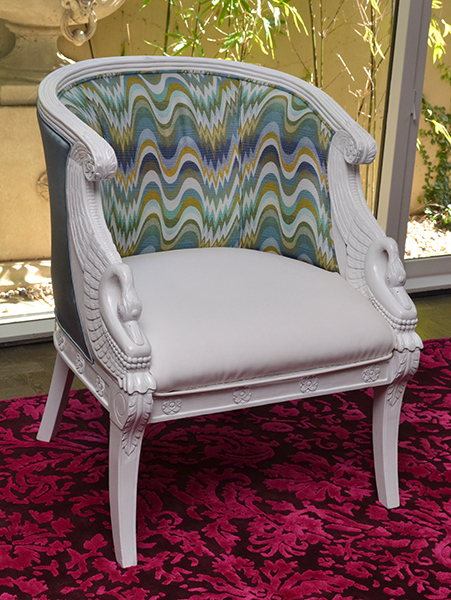 A CUSTOM DESIGNED WHITE PAINTED SALON CHAIR WITH MISSONI FABRIC UPHOLSTERED BACK AND WHITE LEATHER SEAT
