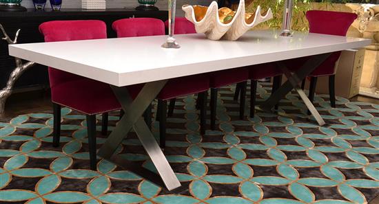 A SET OF TEN CUSTOM MADE DINING CHAIRS IN FUSCHIA VELVET AND SILVER SATIN UPHOLSTERY, (LARGE CIRCULAR WEAR MARK TO THE SEAT OF ONE C...