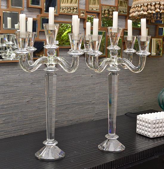 A PAIR OF OF CONTEMPORARY FACETED CRYSTAL FIVE LIGHT CANDELABRA, 52CM HIGH