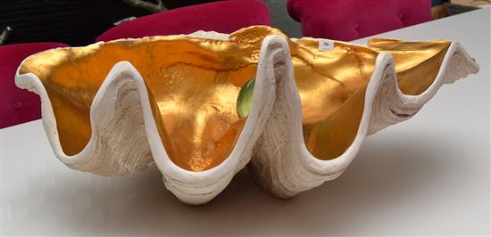 A LARGE COMPOSITE CLAM SHELL CENTREPIECE WITH A GLASS SPHERE, SHELL 70CM WIDE