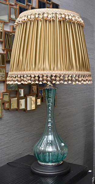 A PAIR OF CONTEMPORARY TURQUOISE GLASS LAMP BASES WITH PLEATED SHADES, 107CM HIGH