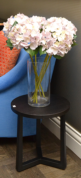 A CONTEMPORARY HARDWOOD OCCASIONAL TABLE WITH CYCLINDRICAL GLASS VASE, 40CM DIAMETER X 46.5CM HIGH