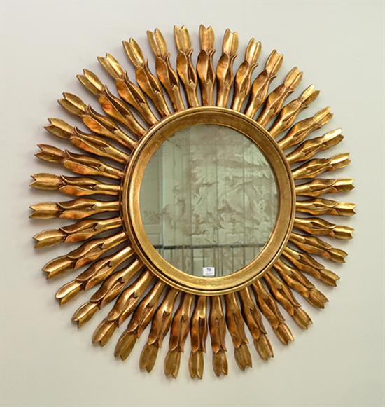 A GILT FRAMED MIRROR WITH RADIATING TULIP DESIGN, 76.5 CM DIAMETER