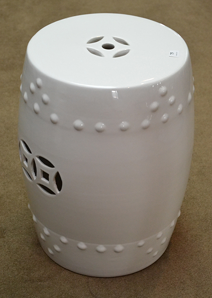 A WHITE GLAZED CERAMIC BARREL STOOL, 43.5 CM HIGH