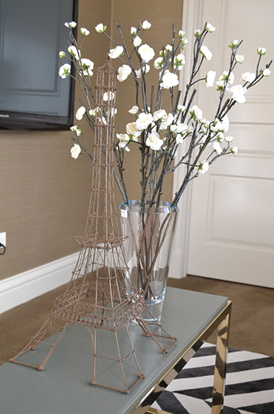 A JONATHAN ADLER PORCELAIN LIDDED BOX, A WIRE MODEL OF THE EIFFEL TOWER AND A CRYSTAL VASE