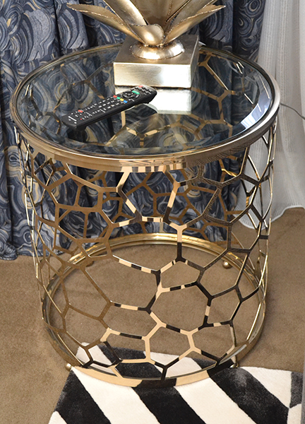 A PAIR OF GILT METAL AND GLASS GEOMETRIC PIERCED SIDE TABLES, 60 CM DIAMETER X 61.5 CM HIGH