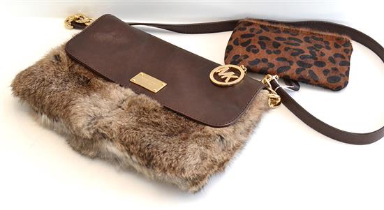 A HANDBAG BY MICHEAL KORS, STYLED IN FUR AND LEATHER, ALONG WITH A PRINTED PONY SKIN PURSE BY MUI MUI