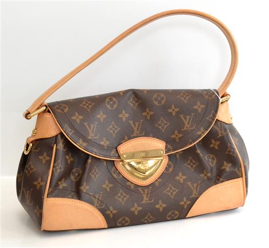 A HANDBAG BY LOUIS VUITTON STYLED IN MONOGRAM CANVAS WITH TAN LEATHER TRIM AND GOLD METAL HARDWARE 32W X 18H X 10D CM