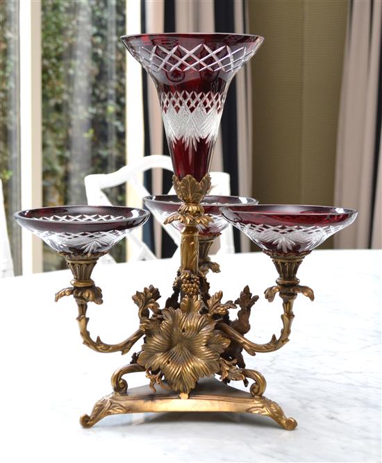 A VICTORIAN STYLE GILT METAL AND FLASHED RUBY GLASS CENTRE PIECE, 43 CM HIGH