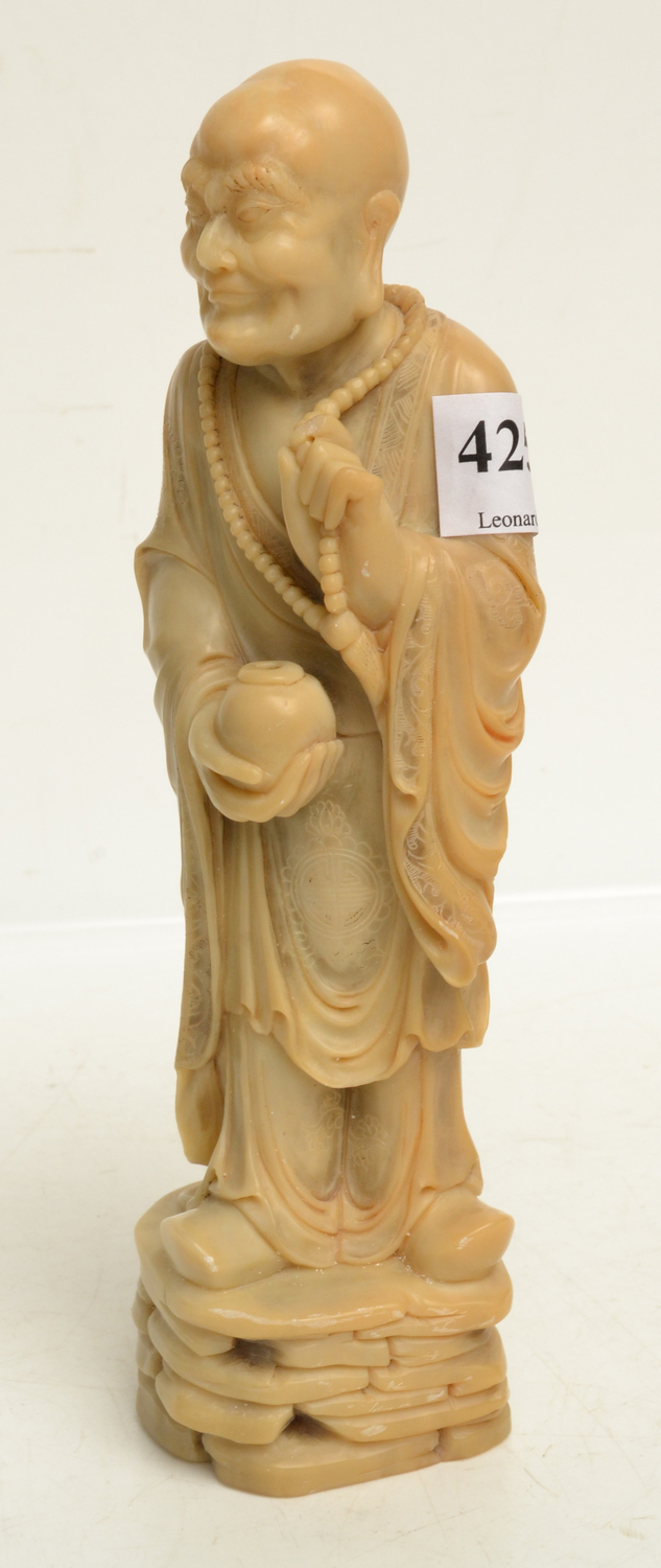 Wearing finely carved drapery with symbolic decoration, 17.5cm high.