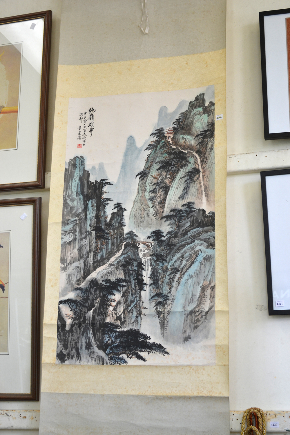 Depicting mountainous landscape scene on rice paper, signed Ye Jing Kang. 91 x 51cm.