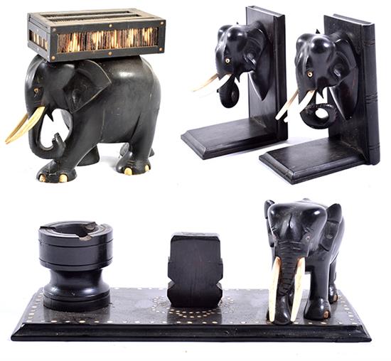 A PORCUPINE QUILL BOX HOUSED ON EBONY ELELPHANT STAND, ALONG WITH A EBONY ELLEPHANT THEMED DESK SET AND A PAIR OF BOOKENDS