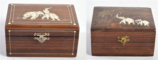 TWO BONE INLAID ELEPHANT THEMED TRINKET BOXES, AND TWO OTHER BOXES