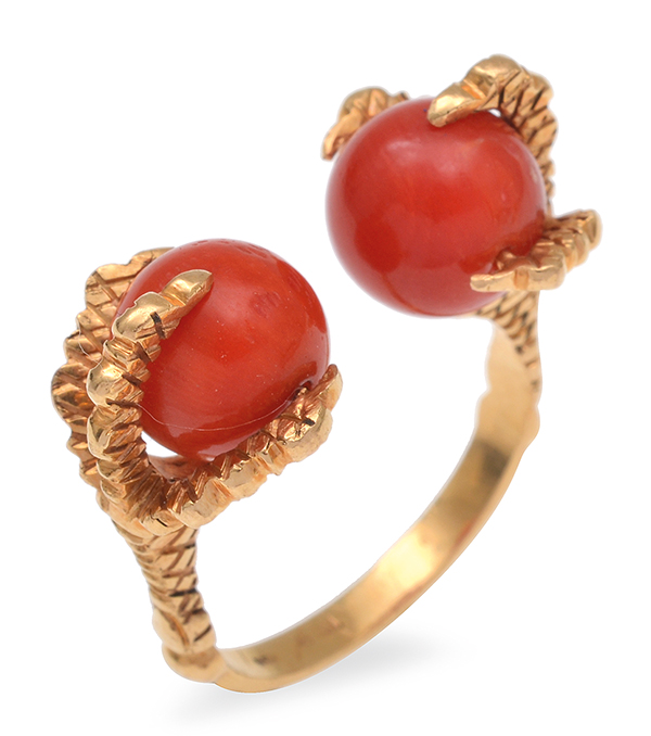 Crafted as two claws each holding a polished coral bead, mounted in 18ct gold, ring size Q.