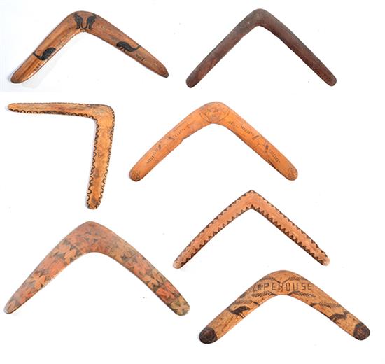 A GROUP OF ABORIGINAL BOOMERANGS WITH BURNT AND PAINTED DESIGN FROM CENTRAL AUSTRALIA, NSW AND VICTORIA